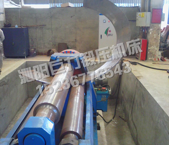 該機型的上輥固定,兩下輥呈傾斜狀做旋轉運動,兩下輥可以同時升降,也可以單升單降,用以完成板材的端部預彎。