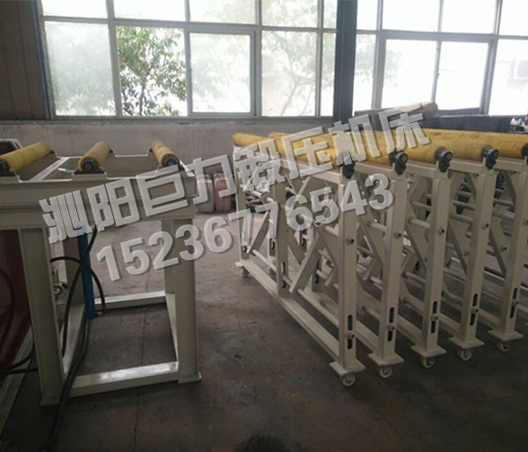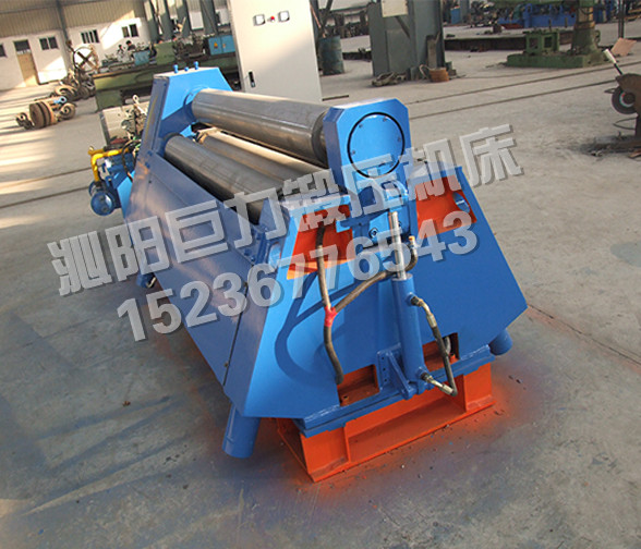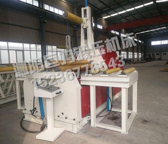 该四辊卷板机与对称三辊卷板机比较,它可以不借助其它设备模具,直接予弯板材端部,而且剩余直边较小;它可以不使板材调头,而卷成工件。