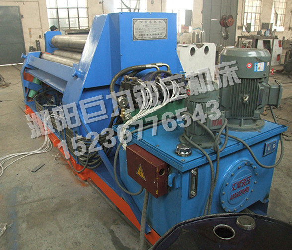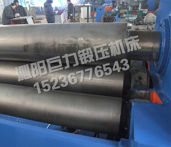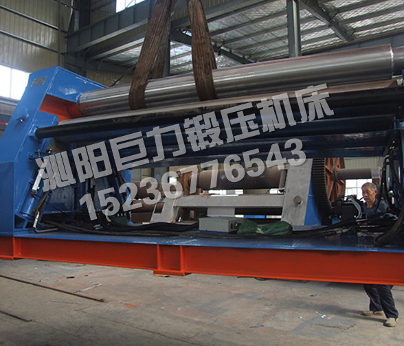 该四辊卷板机与对称三辊卷板机比较,它可以不借助其它设备模具,直接予弯板材端部,而且剩余直边较小;它可以不使板材调头,而卷成工件。